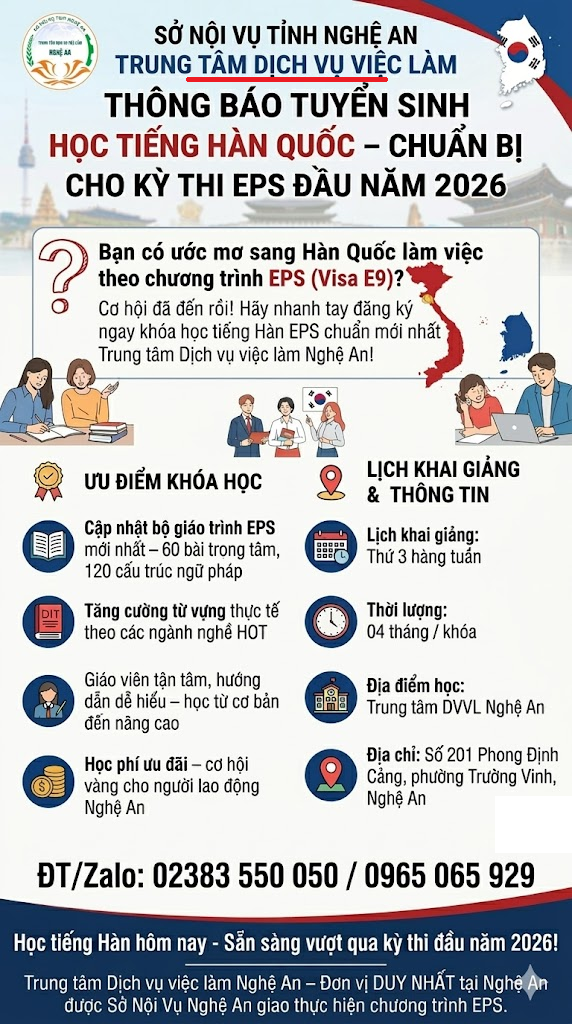 Cơ hội đã đến rồi! Hãy nhanh tay đăng ký ngay khóa học tiếng Hàn EPS chuẩn mới nhất tại Trung tâm Dịch vụ việc làm Nghệ An!